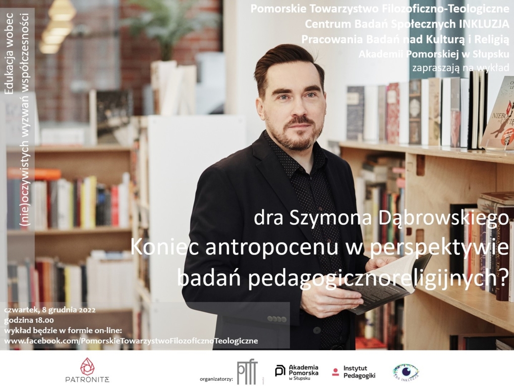 Instytut Pedagogiki, Centrum Badań Społecznych INKLUZJA oraz Pracownia Badań nad Kulturą i Religią zapraszają Państwa na wykład z cyklu "Edukacja wobec (nie)oczywistych wyzwań współczesności". Wykład odbędzie się w formie online we czwartek, 8 grudnia br. o godzinie 18.00. Wykład pt.: "Koniec antropocenu w perspektywie badań pedagogicznoreligijnych?" wygłosi dr Szymon Dąbrowski.