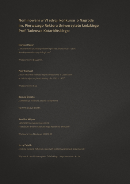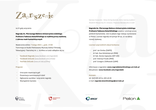 Zaproszenie na VI galę wręczenia Nagrody im. Pierwszego Rektora Uniwersytetu Łódzkiego Profesora Tadeusza Kotarbińskiego