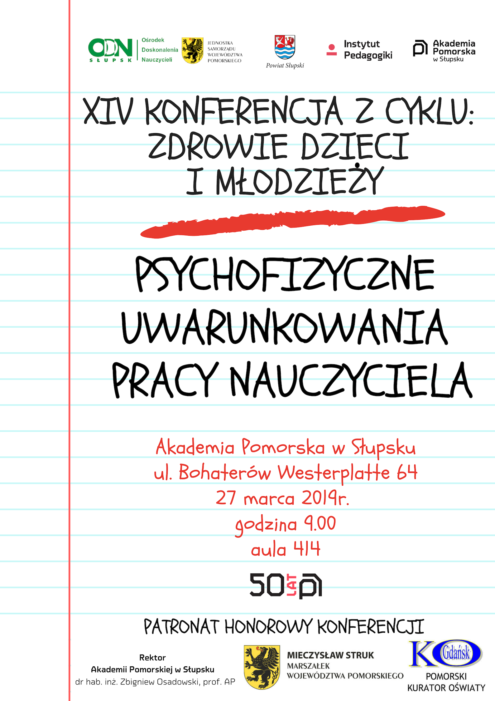 Ośrodek Doskonalenia Nauczycieli w Słupsku, Starostwo Powiatowe w Słupsku, Instytut Pedagogiki Akademii Pomorskiej w Słupsku zapraszają na XIV Konferencję z cyklu Zdrowie Dzieci i Młodzieży. Tym razem dyskusje toczyć się będą wokół Psychofizycznych Uwarunkowań Pracy Nauczyciela.